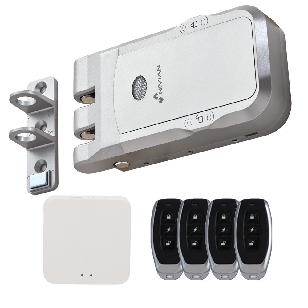 Métodos de apertura | Aplicación móvil, mando a distancia y botones táctiles (en el cerrojo) |