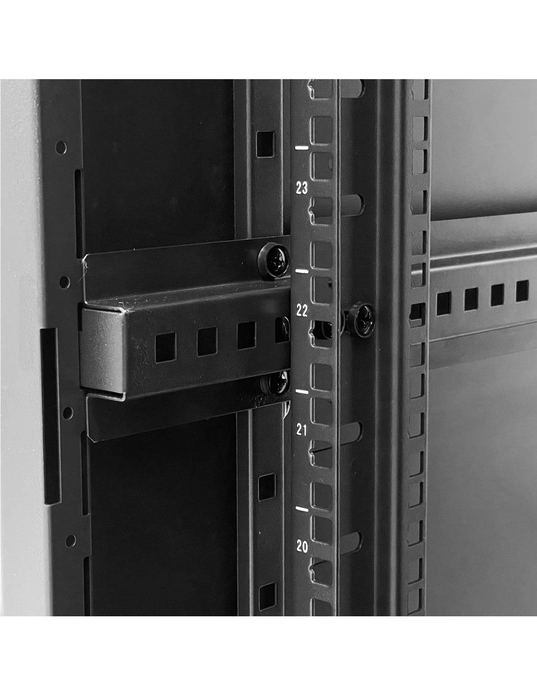 Armario Rack 19" desmontado excelente acabado. Estructura robusta. Polivalente. Puerta frontal de cristal. Puerta posterior sólida. Puerta reversible 180º y sustituibles por puertas de rejilla de 1 o 2 hojas. Paneles laterales extraíbles con llave. Se suministra con ruedas, patas y tornillería. Dispone de espacio para instalar ventiladores de techo y ranuras que permiten la circulación de aire. Acceso superior e inferior de tipo cepillo antipolvo para cableado. Uso general en oficinas y pequeños centros de datos.