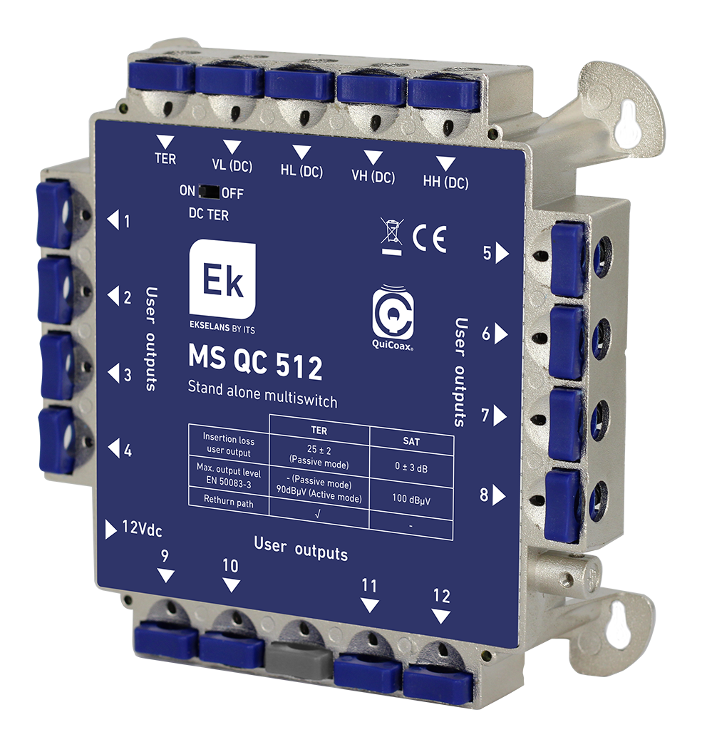 Multiswitch estrella/final de cascada. 5 entradas (4 SAT + 1 TER). 12 salidas usuario. Pérdidas de derivación: SAT <3dB / TER 15dB. Con linea de retorno. Compatible EKOAX.