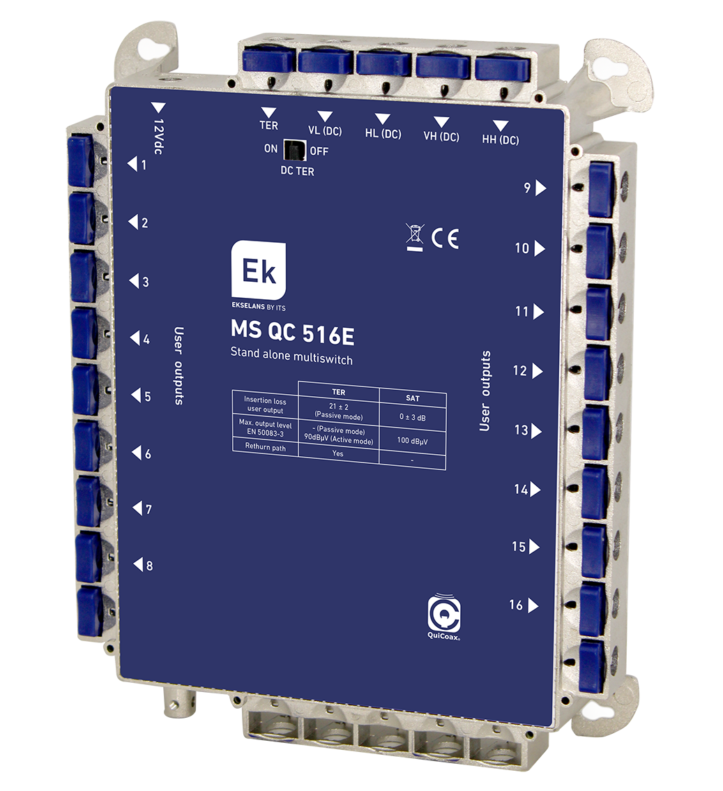 Multiswitch estrella/final de cascada. 5 entradas (4 SAT + 1 TER). 16 salidas usuario. Pérdidas de derivación: SAT <6dB / TER 21dB. Con linea de retorno. Compatible EKOAX.