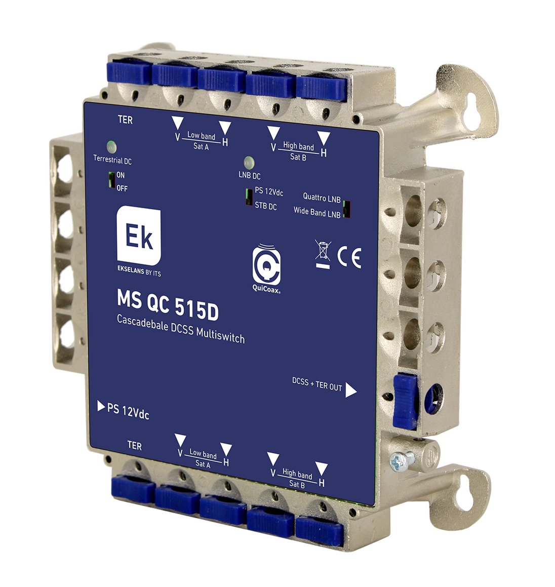 Multiswitch estrella/cascada. 5 entradas. 4 SAT (2 x wideband o 1 x Quatro LNB) + 1 TER. 1x16 DCSS salidas usuario. 5 salidas troncales. Pérdidas de paso <3dB. Con linea de retorno.