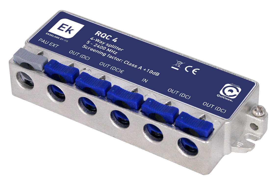 Repartidor clase A de 4 salidas. Banda de paso: 5-2400MHz. Pérdidas de paso: 8,1dB (862MHz) / 10dB (2400MHz). Con paso de corriente DC.