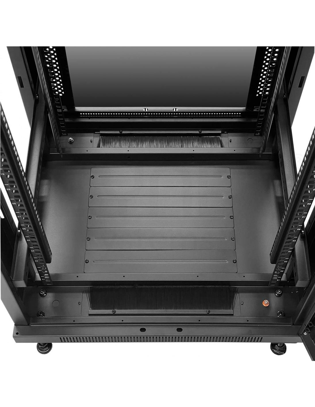 Rack 19" desmontado excelente acabado. Estructura robusta. Polivalente. Puerta frontal de cristal. Puerta posterior sólida. Puerta reversible 180º y sustituibles por puertas de rejilla de 1 o 2 hojas. Paneles laterales extraíbles con llave. Se suministra con ruedas, patas y tornillería. Dispone de espacio para instalar ventiladores de techo y ranuras que permiten la circulación de aire. Acceso superior e inferior de tipo cepillo antipolvo para cableado. Uso general en oficinas y pequeños centros de datos.